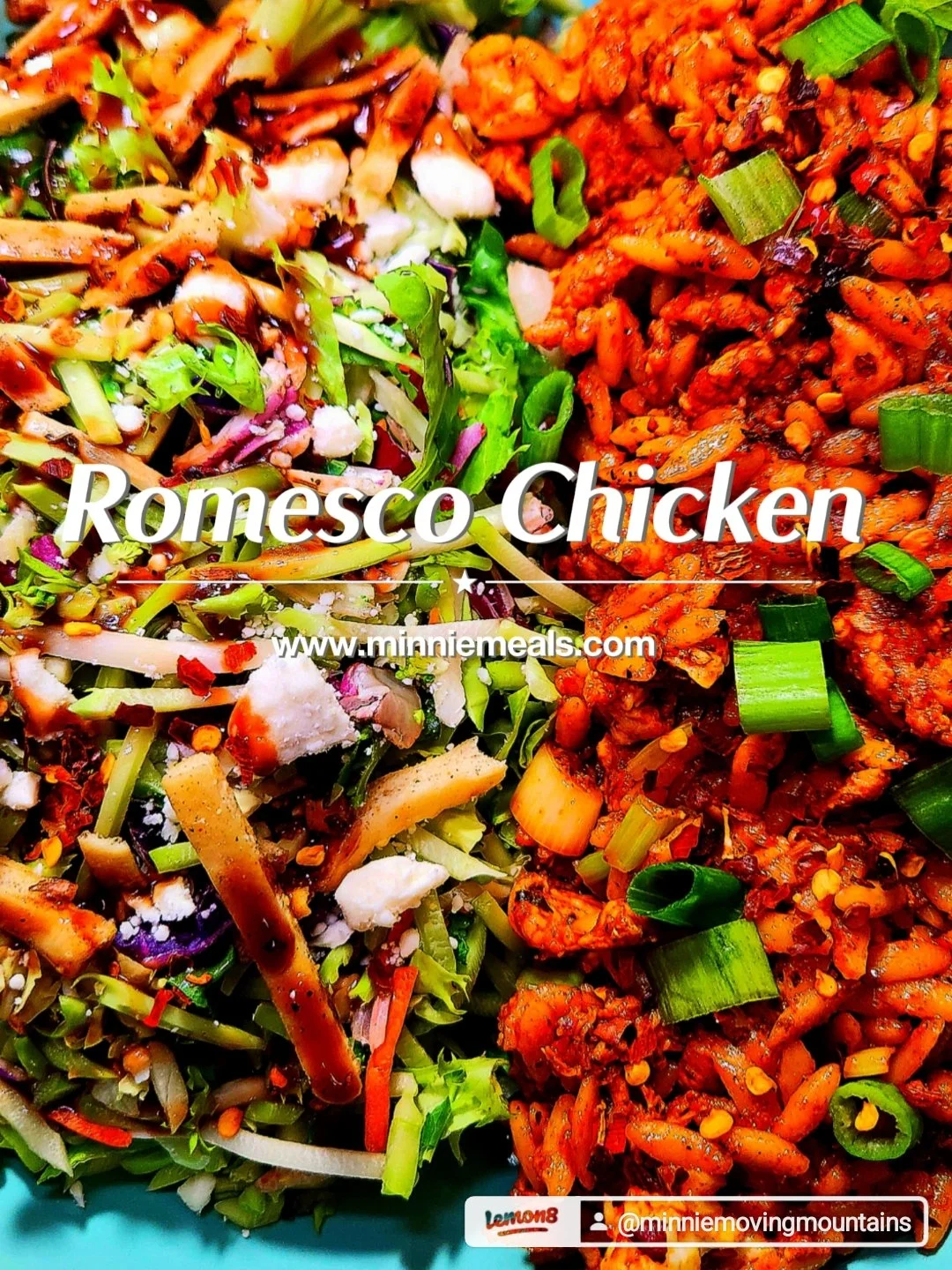 DIFFICULTY LEVEL: EasyINGREDIENTS: Salad Kit, ½ Cup Feta Cheese, Chopped Chicken Breast, 6 TBSP Romesco Sauce, ½ Cup Orzo Pasta, 1 TBSP Paprika, 2 TBSP Garlic Herb Butter, Scallions