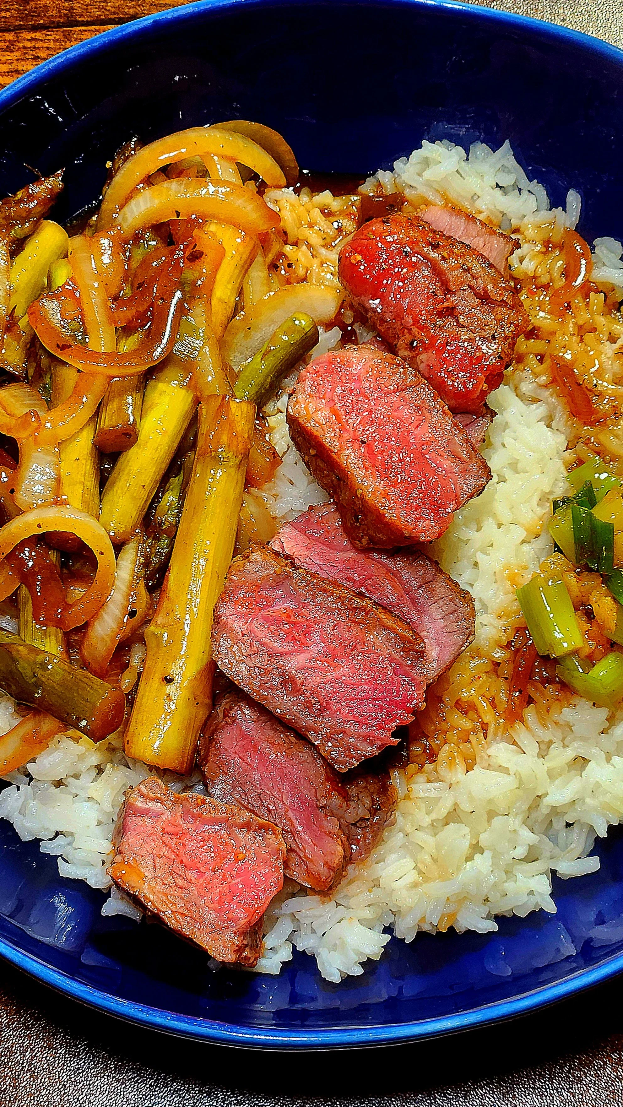SOY GLAZED STEAK WITH ASPARAGUS STIR FRY PLUS JASMINE RICE, AND SCALLION GINGER OIL