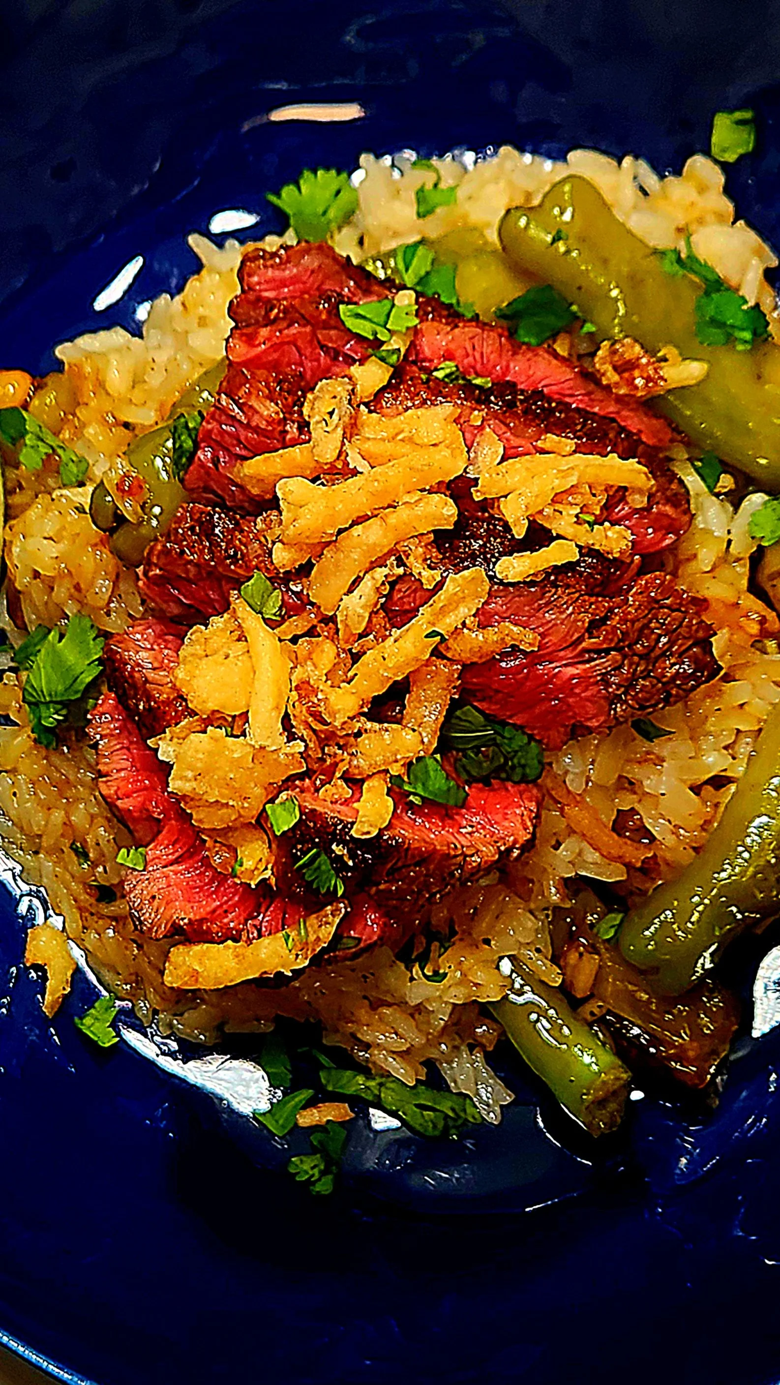 DIFFICULTY LEVEL: EasyINGREDIENTS: 1/8 Cup Sweet Thai Chili, Ranch Steak, 1/4 Cup Sweet Soy Glaze, Cilantro, 1/8 Cup Crispy Fried Onions, 1 TBSP Corn Starch, 1/4 Cup Garlic Scaillion Paste, Lime, Shishito Peppers, 3/4 Cup Jasmine Rice