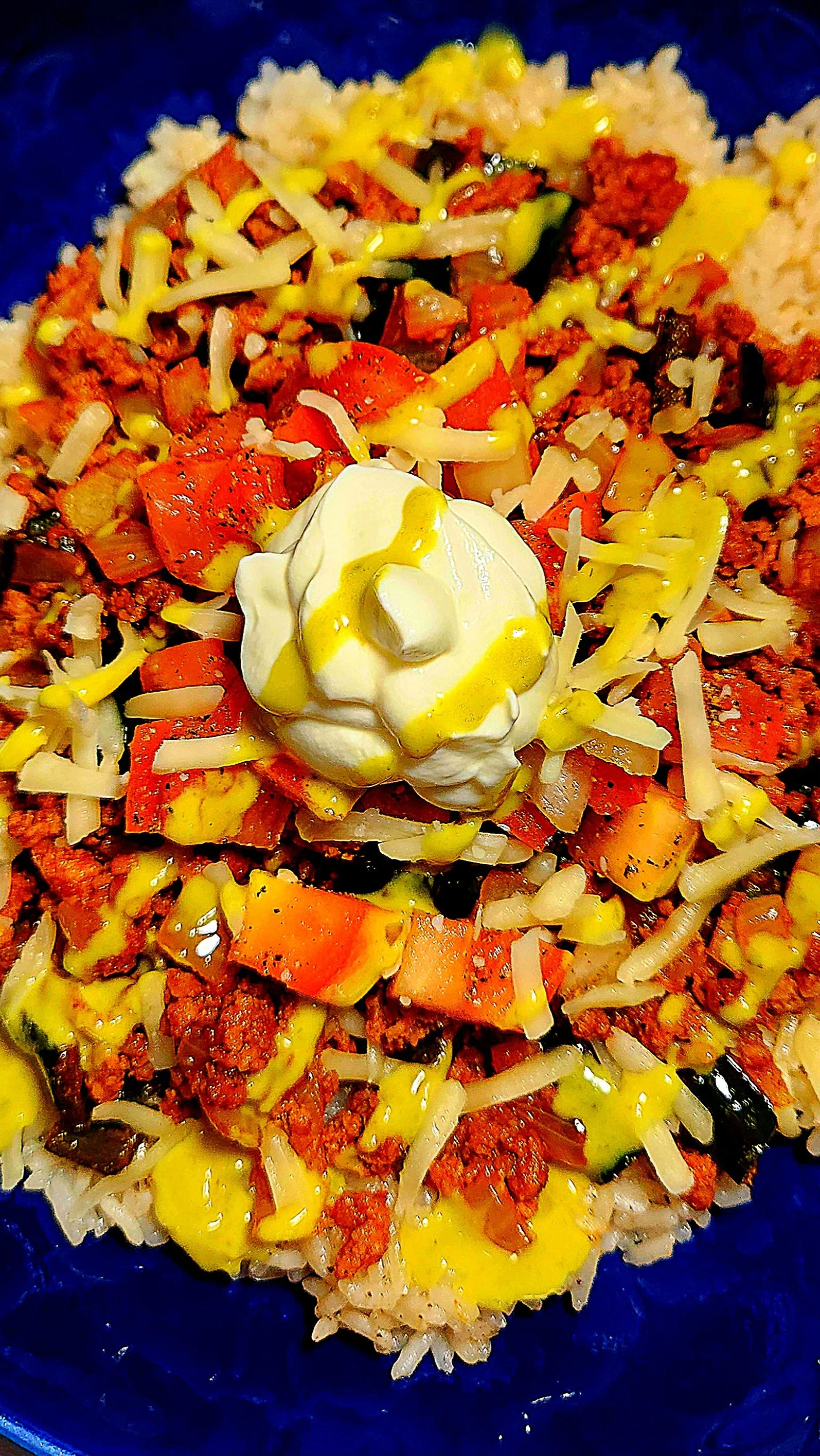 Divide rice between bowls, and top with pork mixture, veggies, cheese, salsa, and crema